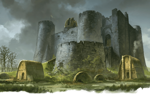 Castle Naerytar was built on dry land, then a deep, dry moat was dug around it. When the mere expanded and surrounded the castle site, the moat flooded and overflowed. Now the whole site is swampy, and large pools of standing water dot the clearing. The castle was built on exposed bedrock, so its foundation is sound and mostly dry even a century after the flooding. Tangled brush and trees grow to within twenty feet of the walls on three sides of the castle. Only the front (southern) face is clear.