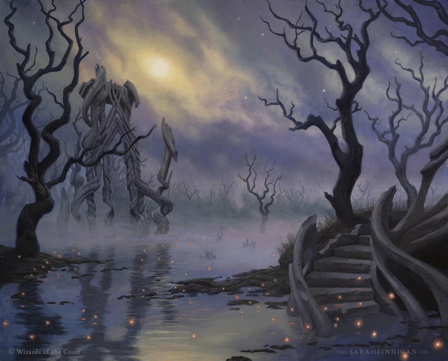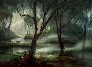 *The Deep Mire is a cold saltwater swamp roughly 100 miles (160 km) long by 30 miles (48 km) wide along the shore. It is a desolate place full of monsters and few members of the civilized races. The swamp constantly grows over time, swallowing homes and property located close to its boundaries. It is believed that the eastern boundary of the Mire is magically bound to trade route north of Aqaumara, since attempts to reroute the road were futile and only caused the expansion of the swamp. The Mire itself is full of trees, vines, quicksand, and hidden islands, and it is generally covered in fog, making visibility very poor. The bones of fallen creatures were clearly visible throughout the Mire. The water is deep enough that it could be navigated on a flat-bottomed boat, but the dark water and hidden obstructions made that choice dangerous.