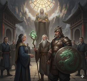 - His armor and shield feature jade dragon motifs, linking him to an ancient order predating the current monastery.