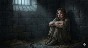 A terrified young woman from Hellensgate, held captive and brutally beaten in the Hunting Lodge. Her suffering is a testament to Talis's cruelty.