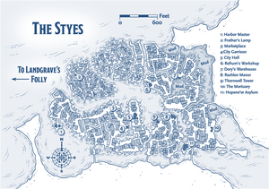 Once, the Styes was a marvelous port district. Its magnificent buildings crowned an artificial island that was the centerpiece of a broad bay, held aloft on great oak pilings. Those huge beams supported great facades of marble grandeur, connected by boardwalks that thronged with richly clothed merchants, exotic travelers, and the passing palanquins of nobility. Known as the Island of Pleasures, the site was a destination for rich and decadent folk up and down the coast.