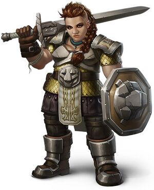 A female shield dwarf guard, known for her quick temper and her readiness to use her blades when provoked. She is honest to a fault, always clarifying why she's angry so others can correct their behavior, and she has zero tolerance for bullying.